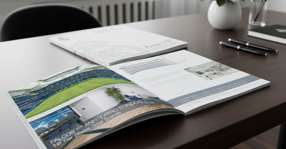 Si repasas el catálogo oficial de zonas VIP del Bernabéu —como el que hemos diseñado y actualizado durante años— verás que no es un simple folleto. Es un documento enorme, lleno de información técnica, visual y comercial sobre palcos, salas de hospitality, distribución de butacas y accesos y características completas de cada espacio.